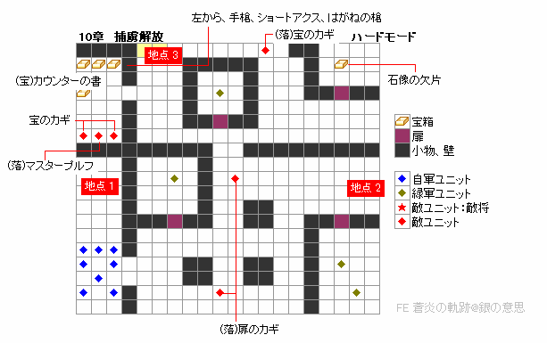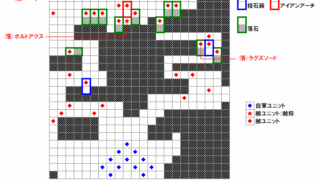 敵将と両脇のアーチャーは射程距離内に入ると動き出します。 敵将はマスタープルフを落とすので、必ず撃破しよう。 攻撃力が高めなので、魔法で体力を削り、ハンマーやリガルソードでトドメをさすと良いでしょう。