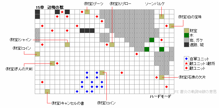 砂漠では、飛行・魔法・盗賊ユニット以外は大幅に移動力が落ちます。敵は全てラグズなので、炎や風の魔法を装備した魔道士は必ず出撃させたいところです。隠しキャラ(?)のソーンバルケが仲間になるので、レテかモゥディも加えておこう。