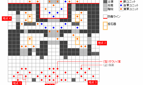 敵将も含め初期配置の竜騎士は、射程距離に入ると動き出します。敵将の撃破でクリアとなってしまいますが、右下の敵兵からは石像の欠片やコインが盗めます。守備力の高いユニットでボスをおびき寄せ、4人のユニットで囲んでしまうといいでしょう。4人の内にシノン(挑発スキルを持つユニット)を入れておけば、かなりの確率で回避するのでオススメです。